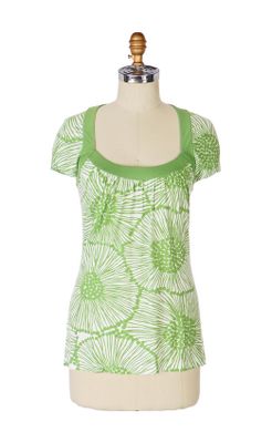 Rebecca Beeson outlines a zoomed-in zinnia print with bands of leafy jersey, creating a fresh-cut tee to green up everyday outfits.