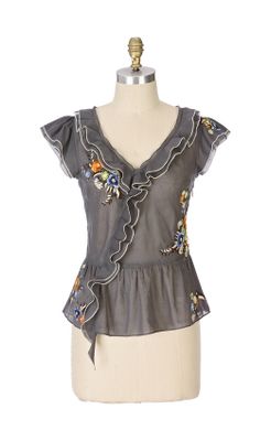 A double-layer of ruffles wraps across flounced organdy embroidered with colorful petals.