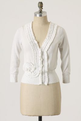 Sparrow shakes up fine-gauge sweaterknit with a frilly, pickstitched placket and a twirly posy applique.