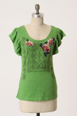 Embroidered roses bloom before an exotic trellis of needlepoint stitches on C. Keer's slubbed cotton tee.