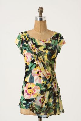 Peruvian lilies cover every square inch of Deletta's pleated, tucked and gathered top.